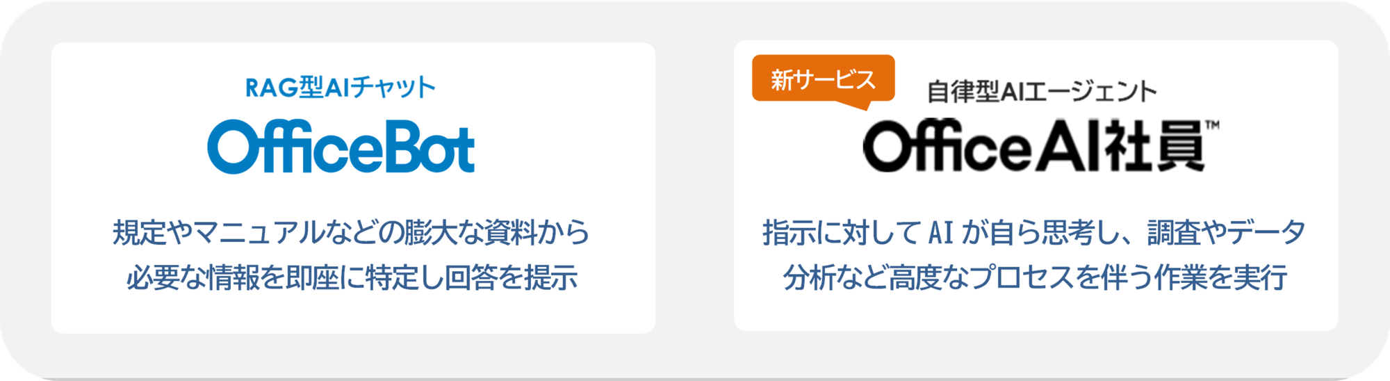 本展示会では、社内ドキュメントを基にナレッジ活用や業務効率化を支援するAIチャットサービス【OfficeBot】に加え、指示に基づき自律的に業務を遂行するAIエージェント【OfficeAI社員】を展示いたします。「情報を探す・答える」というナレッジ共有の自動化から、「思考し計画を立て、実行する」という自律的な業務代行まで、企業のフェーズに合わせた最適なAI活用をご提案いたします。実際の画面によるデモンストレーションから最新のアップデート機能までご紹介いたしますので、企業や組織のAI導入をご検討中の方はこの機会にぜひブースへお越しください。