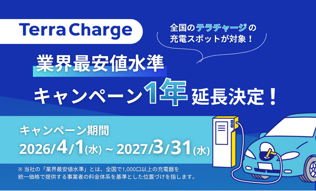 EV(電気自動車)向け充電サービス「Terra Charge(テラチャージ)」を展開するTerra Charge 株式会社(本社:東京都港区、代表取締役社長:徳重徹、以下「当社」)は、2025年10月より実施している超急速・普通充電器の料金を業界最安値水準で提供するキャンペーンについて、ご好評につき2027年3月31日(水)まで1年間延長することをお知らせいたします。
