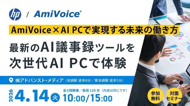 2026年4月14日(火)、株式会社アドバンスト・メディア(本社:東京都豊島区、代表取締役会長兼社長:鈴木清幸 以下、アドバンスト・メディア)は、「AmiVoice×AI PCで実現する未来の働き方─最新のAI議事録ツールを次世代AI PCで体験」を共催いたします。