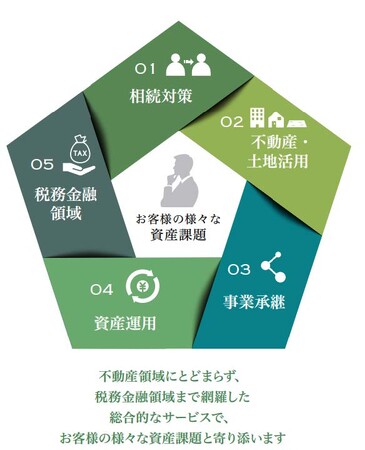 東急不動産ホールディングスグループは、都市開発、戦略投資、管理運営、不動産流通など、広範な事業領域で多様なお客様との接点を有しています。近年、これらのお客様から寄せられる資産課題のご相談は多岐に渡り、より複雑かつ専門的な知見を必要とするものへと変容しています。 これを受け、グループで培ってきた資産コンサルティングの知見と、保有する多彩な事業領域を融合することで、不動産の枠を超えた「相続対策」「資産運用・所得対策」「不動産活用対策」「事業承継対策」等の幅広いニーズに対する提案体制を構築いたしました。 当社グループとのお取引を起点として、お客様世帯の資産拡大や防衛を強力にバックアップいたします。