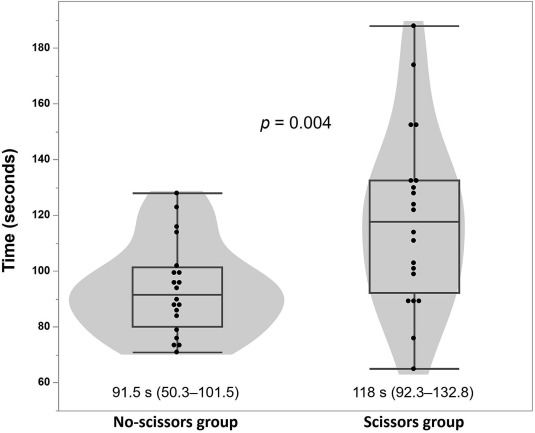 その結果、AEDの電源投入から除細動までの時間は、ハサミを使用した群で中央値118秒、使用しなかった群で91.5秒となり、統計学的な推定で約24秒の遅れが確認されました(p=0.004)。