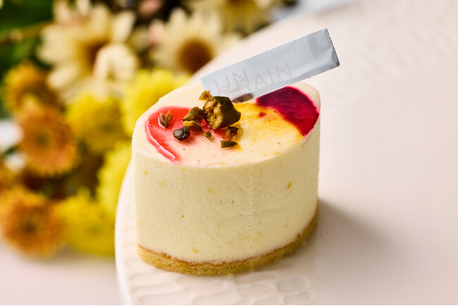 南仏・ヴァローリス周辺で親しまれている地方菓子「カリソン」をモチーフに、ハーブや柑橘類の香りをアクセントとして、創作の余韻を感じる味わいに仕上げました。香ばしいアーモンドのジョコンド生地を土台に、果実味が凝縮されたドライフルーツをちりばめたヌガームースを重ね、ローズマリーやピンクペッパーをきかせた白ワインコンポートのアンズをのせています。全体は爽やかな酸味のレモンムースで包み込み、表面はキャンバスに見立て、アンズや赤すぐり、カシスなどで一つひとつ丁寧に彩色しました。