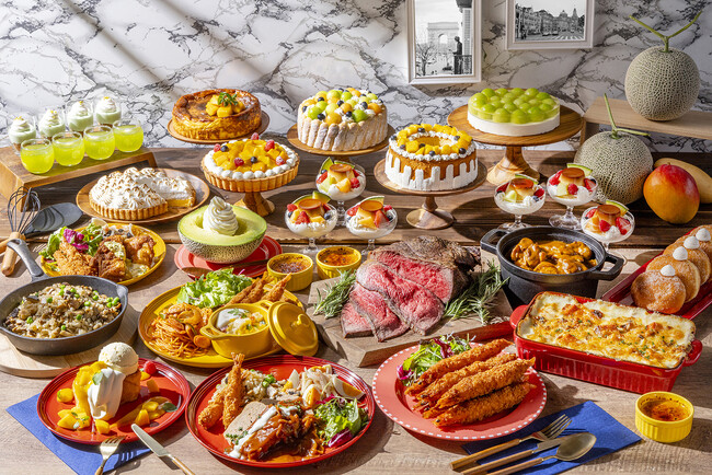 デザートには、旬のメロンとマンゴーを取り入れたスイーツが並びます。清涼感あふれる「メロンのレアチーズケーキ」やクランブルとホイップを重ねた三層仕立ての「メロンババロア」、プリンにメロンをトッピングした「プリン・ア・ラ・モード」のほか、北海道ミルクをたっぷり含ませた「マンゴーフレンチトースト」や「マンゴーのメレンゲパイ」などが、ビュッフェ台を彩ります。