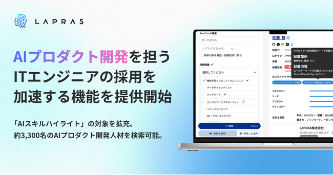 LAPRAS、需要が急拡大するAIプロダクト開発エンジニアの採用を支援する新機能を追加