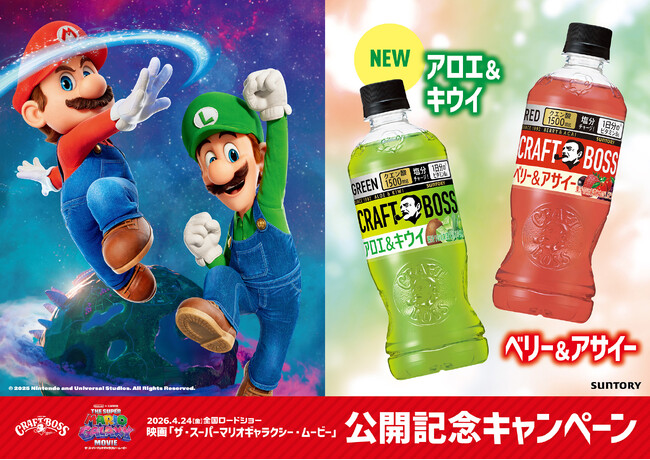 サントリー食品インターナショナル(株)は、話題の映画『ザ・スーパーマリオギャラクシー・ムービー』とのコラボ第2弾として、カメ族の王(=BOSS)クッパとクッパJr.をモチーフにしたボスジャン親子セットが当たるキャンペーンを3月30日(月)より行います。また、翌日より、「クラフトボス果汁シリーズ」から、緑のパッケージが印象的な「クラフトボス アロエ&キウイ」を新発売し、さらに、赤いパッケージが印象的な「クラフトボス ベリー&アサイー」をパッケージリニューアルします。