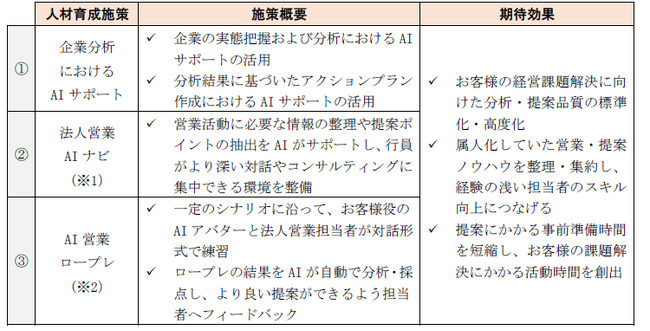 具体的には、2026 年4 月から「企業分析におけるAI サポート」、「法人営業AI ナビ」、「AI 営業ロープレ」の3 つの人材育成施策を本格展開していく予定です。