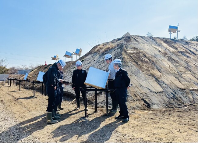 本実証ではSARの電波を反射する一辺60cmの小型三面コーナーリフレクタが準備され、日特建設が2025年に茨城県坂東市に開設した開発技術の実証実験を行う試験場「NITTOCテストフィールド」内の盛土法面に複数設置されました。