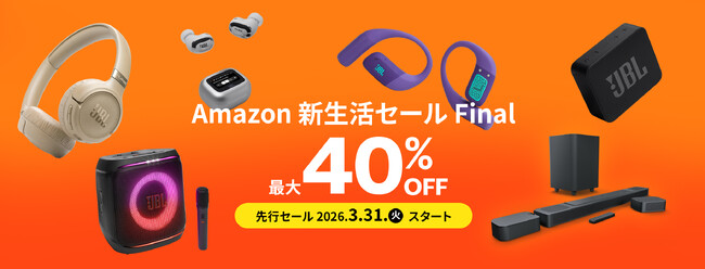 アメリカ カリフォルニア発祥の世界最大級のオーディオブランド「JBL」を擁するハーマンインターナショナル株式会社(本社:東京都千代田区、代表取締役:桑原拓磨)は、運営するJBL公式Amazon店にて3月31日(火)~4月6日(月)(先行セール期間含む)にて開催されるAmazon新生活セールにおいて、人気のワイヤレスイヤホンやポータブルスピーカー、サウンドバーをはじめとする公式限定モデルを、最大40%オフのセール価格で販売いたします。