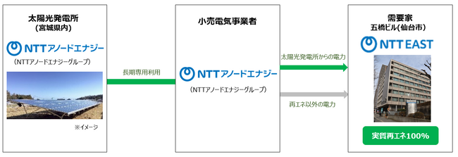 NTT東日本株式会社 宮城事業部(執行役員宮城事業部長:須藤 博史、以下 NTT東日本)は、仙台市若林区に所在する自社オフィスビル「五橋ビル」において、NTTアノードエナジー株式会社(本社:東京都港区、代表取締役社長 岸本 照之、以下、「NTTアノードエナジー」)と連携し、再生可能エネルギーを長期で調達するオフサイト型コーポレートPPA(以下「オフサイトPPA」)の導入を開始します。