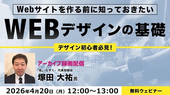 今回アーカイブ配信するセミナーの講師は、Web・Officeインストラクターとして大学・専門学校、企業などでデザイン講義・研修を多数行う塚田大祐氏。Webデザインの基礎とレイアウトの基礎について分かりやすく解説していただきました。ご興味をお持ちの方はぜひご視聴ください。