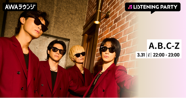 AWA株式会社(本社:東京都港区、代表取締役CEO:冨樫晃己)が運営する、サブスクリプション型(定額制)音楽ストリーミングサービス「AWA(アワ)」は、2026年3月31日(火) 22:00~23:00にて、無料で誰でも参加できるオンライン空間「AWAラウンジ」で、A.B.C-Z特集のリスニングパーティーを開催いたします。