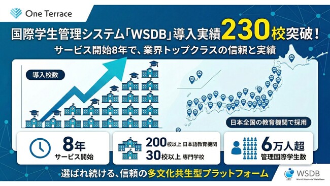 株式会社OneTerrace(本社:東京都港区、代表取締役:石中達也)が販売する国際学生管理システム「WSDB」は、2026年3月現在、累計導入校数が230校を突破したことをお知らせいたします。