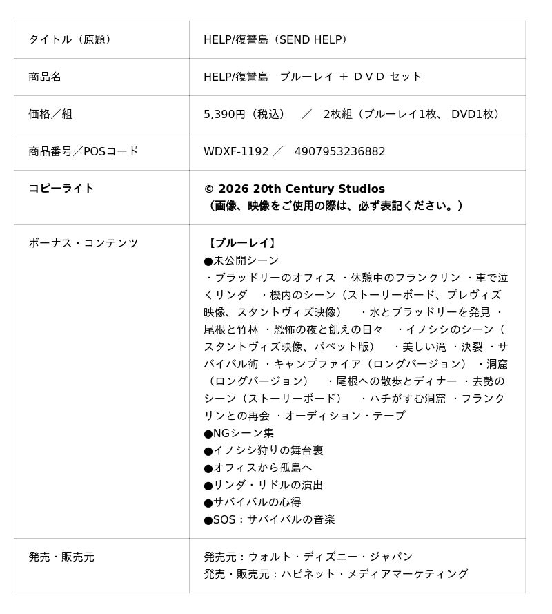 この度発売のブルーレイ+DVDセット、デジタル配信(購入)には、惜しくも本編では採用されなかった未公開シーンや、もしもの時の参考になるかもしれない(?)「サバイバルの心得」、ついクスッときてしまうNGシーン集など、充実したボーナス・コンテンツを収録。鬼才サム・ライミ監督が全ての働く人に捧げる、予測不能なノンストップ“復讐エンターテインメント”!『HELP/復讐島』を、ぜひブルーレイ+DVDセット、そしてデジタル配信(購入/レンタル)でお楽しみください。