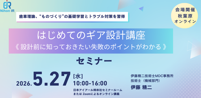 アイアール技術者教育研究所は、初めてギア設計に取り組む際に起こりやすい騒音・動作不良・破損などのトラブル要因を、歯車の基礎理論と設計手順の両面から整理できる公開セミナーを開催します。