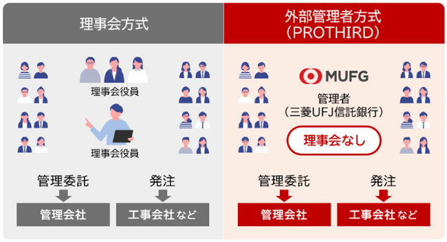 三菱 UFJ 信託銀行が提供するマンション管理組合向け外部管理者サービス『PROTHIRD』は、三菱UFJ信託銀行が、マンション管理組合と“管理者業務委託契約”を締結し、これまで区分所有者で構成される「理事会」が担ってきた業務や管理組合運営を、「外部管理者」として受託するサービスです。