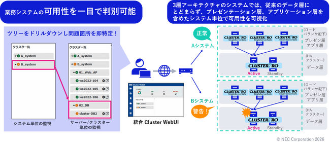 新商品では、3層アーキテクチャの業務システムにおいて、従来のデータ層にとどまらず、プレゼンテーション層、アプリケーション層を含めたシステム単位で可用性を可視化する「システムHA」に基づく運用管理環境を提供します。「システムHA」は、NECが新たに提案するHAクラスタリングを拡張した運用管理方法であり、個々のサーバーの健全性だけでなく、業務システム全体の稼働状況も一元的に把握することができ、システムの安定稼働を盤石なものとし、お客さまのビジネス継続性を強力に支援します。