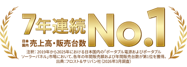 * 2019年から2025年における日本国内の「ポータブル電源およびポータブルソーラーパネル」市場において、各年の年間販売額および年間販売台数が第1位を獲得。出典:フロスト&サリバン社(2026年3月調査)
