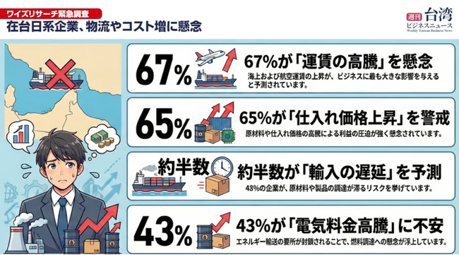 中東情勢が緊迫化し、ホルムズ海峡が事実上封鎖される中、ワイズリサーチは在台日系企業を対象に緊急調査(実施期間:2026年3月4日~17日、有効回答:69社)を実施しました。