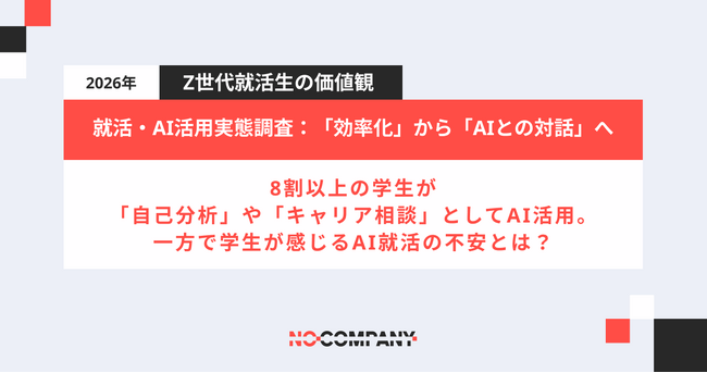 採用マーケティング支援を行う株式会社No Company(本社:東京都港区、代表取締役:秋山真)は、2026年卒・27年卒予定の大学3年生、大学4年生の学生を対象に、就職活動における「AI活用」をテーマとした最新の意識調査を実施いたしました。