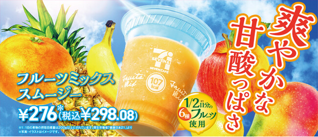 株式会社セブン‐イレブン・ジャパン(本社:東京都千代田区、代表取締役社長:阿久津 知洋)は、「セブンカフェスムージー」より、6種類のフルーツを贅沢に使用した「フルーツミックススムージー」を3月31日(火)から、首都圏を除く全国のセブン-イレブンで発売します。