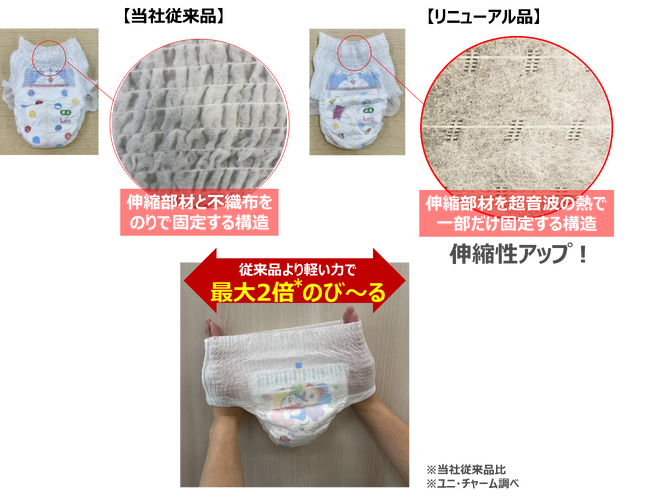 そこでこのたび、『マミーポコパンツ』に「のび~るフィット」技術を搭載することで、成長したお子さまの体形の変化にやさしくフィットしながら、今のサイズをより長く快適にお使いいただける商品へと刷新します。