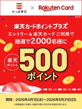 コロワイドグループのかっぱ寿司(カッパ・クリエイト(株) 本社:神奈川県横浜市、代表取締役社長:山角豪)は、2026年4月1日(水)~2026年5月31日(日)の期間、かっぱ寿司をご利用いただいたお客様を対象に、楽天カード株式会社が運営する「楽天カードポイントプラス」にて、抽選で2,000名様に「楽天ポイント」500ポイントが当たるキャンペーンを開催いたします。