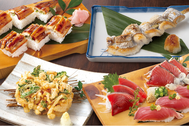 4月の旬メニューでは、まずはこれを食べるべし。「春かつお(刺身・たたき・寿司セット)」(1200円)。春から初夏にかけて黒潮に乗って北上する初かつおを、創業90年を迎える豊洲市場の老舗仲卸「米川水産」が目利きし、一尾まるごと店舗へ直送。鮮度抜群のかつおを、魚を知り尽くした職人が刺身・たたき・寿司に仕立てます。三つの味わいを一度に楽しめるお得な一皿です。