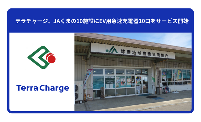 EV(電気自動車)向け充電サービス「Terra Charge(テラチャージ)」を展開するTerra Charge 株式会社(本社:東京都港区、代表取締役社長:徳重徹、以下「当社」)は、JAくま(球磨地域農業協同組合)(本所:熊本県球磨郡錦町、代表理事組合長:福田勝徳、以下「JAくま」)のJAくま 本所、JAくま 人吉支所、総合葬祭 やすらぎ会館 中央、Aコープ なかくまなど計10施設へ50kW出力のEV用急速充電器10口をサービス開始いたしました。