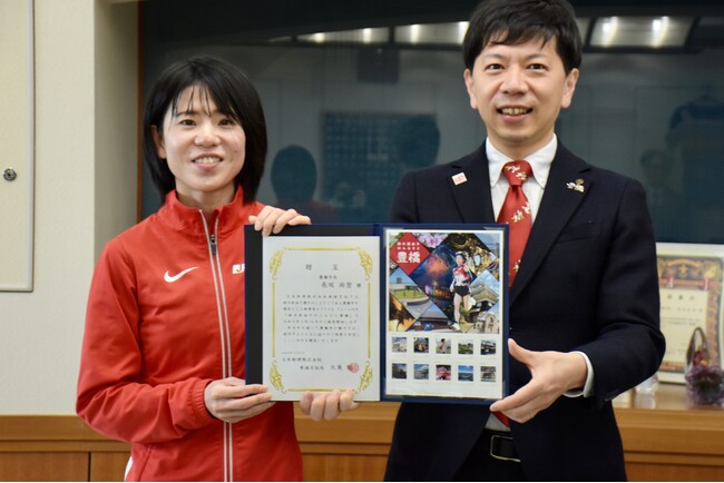 この日は、亜由子選手のほか、伊藤文人豊橋南郵便局長や伊藤誠浩豊橋郵便局長、山本良振草郵便局長らも市役所を訪問。市側へオリジナルフレーム切手を寄贈しました。
