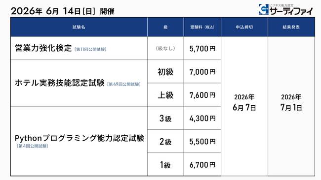 株式会社サーティファイ(本社:東京都中央区、代表取締役:瀧澤茂、以下「サーティファイ」)は、2026年6月14日(日)に開催する「営業力強化検定」「ホテル実務技能認定試験」「Pythonプログラミング能力認定試験」の公開試験の申込受付を2026年3月31日より開始しました。