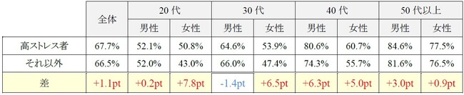 企業が実施するストレスチェックでは、ストレスによる不調が顕著な人や、今後さらに不調が進むリスクが高い人を「高ストレス者」と選定し、医師による面接指導の対象としています。今回、高ストレス者とそれ以外の人について、健康診断の「有所見率」(要再検査・要治療など、異常所見が認められた人の割合)を確認したところ、高ストレス者の有所見率が高く、“こころ”の健康(ストレスチェック)と“カラダ”の健康(健診結果)に明らかな相関がみられました。