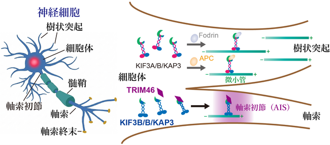 ◆神経細胞の軸索初節(Axon Initial Segment, AIS)は、神経機能にとり非常に重要です。その形成に必須なタンパク質 TRIM46 が、モータータンパク質 キネシン‐2(KIF3)によって選択的に輸送される分子機構を明らかにしました。
