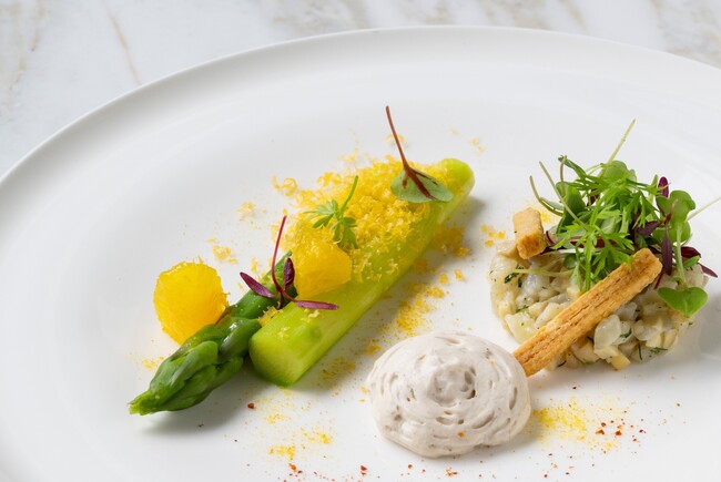 グリーンアスパラガス 真鯛のマリネ タルタル仕立て ミモレット パルメザンチーズのサブレ 小さなサラダ