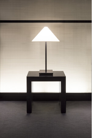 本インスタレーションの核となるのは、1982年にジョルジオ・アルマーニ自らが手がけたテーブルランプ “Logo Lamp(ロゴ ランプ)” です。デザインスケッチに向き合う手元をやわらかく照らすために生まれたこのランプは、光を的確に落としながらも視界を遮らない、独自のフォルムを備えています。そこには、機能性と美しさを両立させるアルマーニの哲学が凝縮され、アルマーニ / カーザの美学を最も純粋に映し出すアイコンとして、今なお愛され続けています。