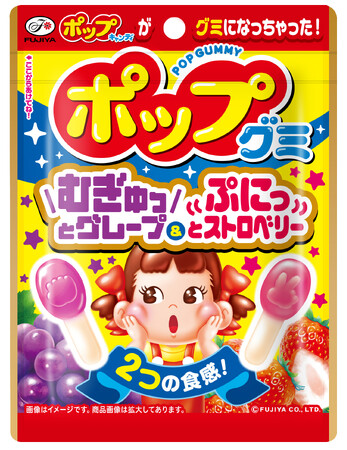 1954年発売の不二家の定番人気棒付きキャンディ「ポップキャンディ」が、グミになって登場。ポップキャンディに使用しているものと同じ果汁を配合し、2色の生地でキャンディと棒をイメージしました。表面にじゃんけん模様が入ったポップキャンディの遊び心はそのままに、「むぎゅっ」「ぷにっ」の2種類の食感が楽しめる「ポップグミ」をぜひお試しください。