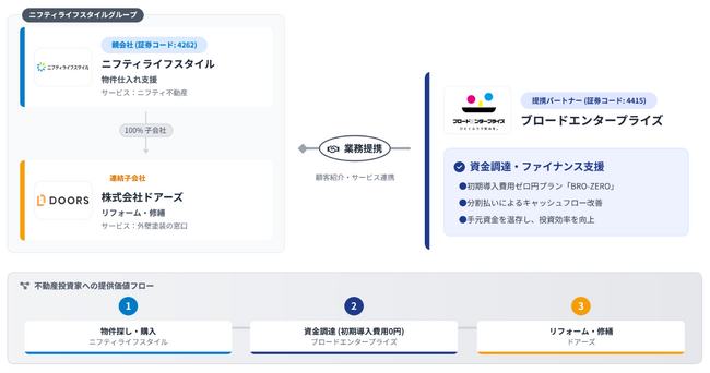 国内最大級の不動産物件情報検索プラットフォーム「ニフティ不動産」を提供するニフティライフスタイル株式会社(本社:東京都中野区、代表取締役社長:成田 隆志、証券コード:4262、以下「当社」)は、当社の連結子会社である株式会社ドアーズ(本社:東京都港区、代表取締役社長:輿石 雅志、以下「ドアーズ」)及び、不動産設備・リノベーションの分割払いフィナンシャルスキームを提供する株式会社ブロードエンタープライズ(本社:大阪府大阪市、代表取締役社長:中西 良祐、証券コード:4415、以下「ブロードエンタープライズ」)と協業し、不動産投資家向けに3社協業のもと、物件選定から購入後の改修(リフォーム/修繕) とその資金調達までをワンストップで支援する体制を構築することをお知らせいたします。