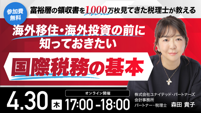 4月30日(木)17時よりオンライン開催!「富裕層1,000万枚の領収書を見た税理士」が解説 海外移住・投資前に知るべき国際税務の基本