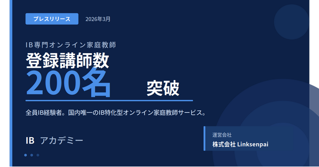 株式会社Linksenpai(所在地:東京都渋谷区、代表取締役:吉田志織)が運営するIB(国際バカロレア)専門 オンライン家庭教師サービス「IBアカデミー」は、2026年3月、登録講師数が200名を突破したことをお知ら せします。 日本国内のIB認定校・候補校数は2025年12月時点で260校(文部科学省IB教育推進コンソーシアム調べ)に 達し、IB生の数は年々増加しています。一方で、IBの高度な学習要求に応えられる専門家庭教師は慢性的に不 足しており、IBアカデミーはこの課題に応えるべく講師ネットワークの拡充を続けてきました。
