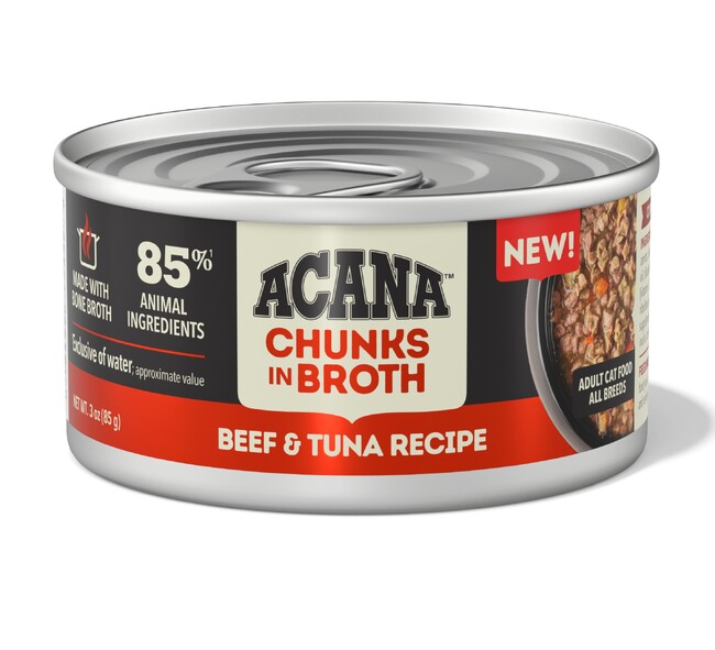 ACANAチャンク イン ブロスは、猫本来の肉食性に配慮し、動物性原材料を85%配合したウェットフードです。やわらかな肉の塊(チャンク)を、旨み豊かな丸ごとの骨スープで包み込んだ設計で、嗜好性と水分補給の両立を実現しました。