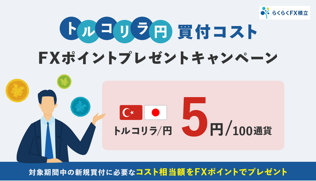 株式会社外為どっとコム(本社:東京都港区、代表取締役社長:竹内 淳)は、FX積立『らくらくFX積立』におきまして、2026年3月30日(月)より「らくつむトルコリラ/円買付コスト FXポイントプレゼントキャンペーン」を実施します。