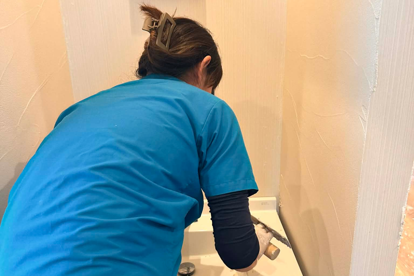 洗面所の壁面に漆喰を塗る様子