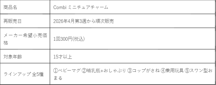コンビ株式会社(本社:東京都台東区 代表取締役社長:松浦康詞、以下コンビ)のベビー用品をミニチュアチャームにした『Combi ミニチュアチャーム』が、株式会社バンダイ(本社:東京都台東区、以下バンダイ)が展開する「ガシャポン®」(※)にて再販売します。価格は1回300円(税込)で、全国のガシャポンオフィシャルショップ、玩具売場、量販店、家電店などに設置されたガシャポン販売機シリーズにて、2026年4月第3週より順次販売されます。