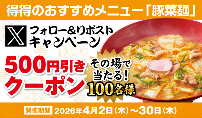 株式会社家族亭(本社:大阪府大阪市、代表取締役執行役員社長:音羽博之)が運営するうどんチェーン「得得(とくとく)」は、2026年4月2日(木)~4月30日(木)の期間、得得公式Xにて「得得デジタル500円引きクーポン」が抽選で100名様に当たる『Xフォロー&リポストキャンペーン』を開催いたします。