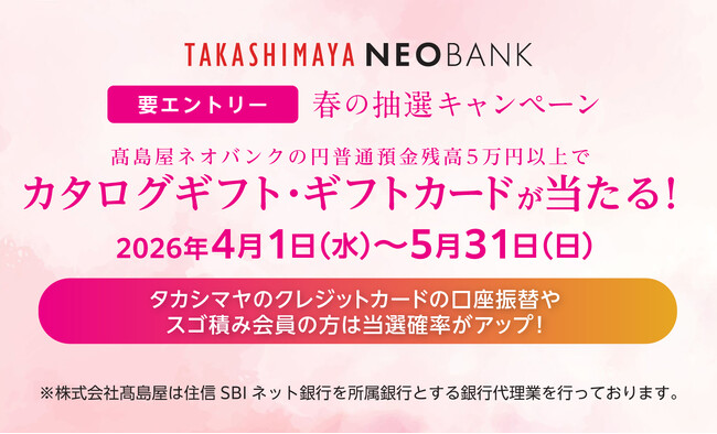 株式会社高島屋と連結子会社である高島屋ファイナンシャル・パートナーズ株式会社、及び住信SBIネット銀行株式会社は、より多くのお客様に高島屋ネオバンクをご利用いただくため、「春の抽選キャンペーン高島屋ネオバンクの円普通預金残高5万円以上でカタログギフト・ギフトカードが当たる!」を2026年4月1日(水)から実施します。