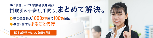 本サイトでは、サービス概要に加え、B2B決済サービスの仕組みや導入メリット、活用シーンなどを分かりやすく紹介しています。また、掛金の未回収リスクへの対策や、請求・入金管理などの決済業務の効率化をご検討中の企業さまに役立つ情報も掲載しています。