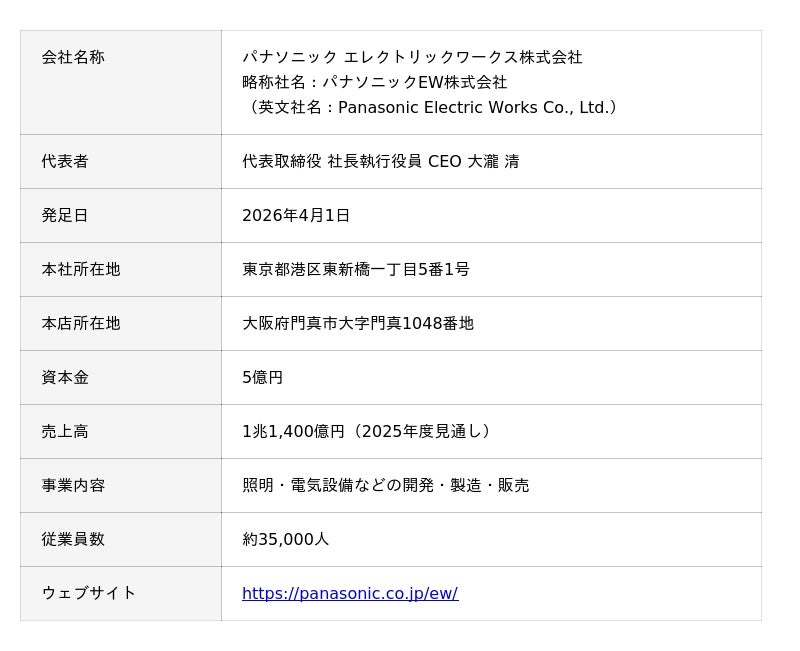 パナソニック エレクトリックワークス株式会社(本社:東京都港区、代表取締役 社長執行役員CEO:大瀧 清、以下、パナソニック エレクトリックワークス)は、2026年4月1日、パナソニックグループの体制変更に伴い、以下の通り新体制を発足しました。パナソニック エレクトリックワークスは、パナソニックグループ創業製品である配線器具など、主に従来のパナソニック株式会社 エレクトリックワークス社における事業を引き継ぐ、新事業会社です。