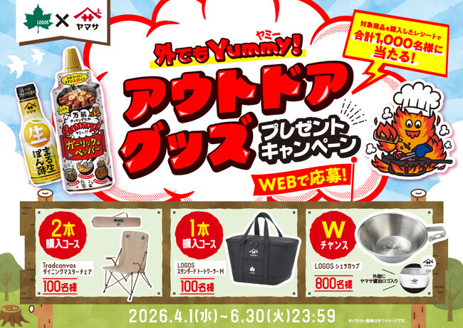株式会社ロゴスコーポレーション(本社:大阪市住之江区、代表取締役社長:柴田茂樹)が展開するアウトドアブランドの「LOGOS」は、ヤマサ醤油株式会社(本社:千葉県銚子市、代表取締役社長:石橋 直幸)とコラボレーションし、「外でもYummy!(ヤミー)アウトドアグッズ プレゼントキャンペーン」を2026年4月1日(水)より実施いたします。