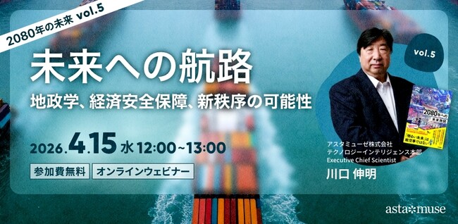 アスタミューゼ株式会社(本社:東京都千代田区、代表取締役社長 永井歩)は、2026年4月15日(水)12:00-13:00に、『2060 未来創造の白地図』および『2080年への未来地図』著者、弊社のExecutive Chief Scientistである川口伸明による無料ウェビナー「未来への航路:地政学、経済安全保障、新秩序の可能性 ~2080年の未来シリーズvol.5~」を開催いたします。書籍に取り上げた技術領域や社会課題、未来世界について語るウェビナーです。
