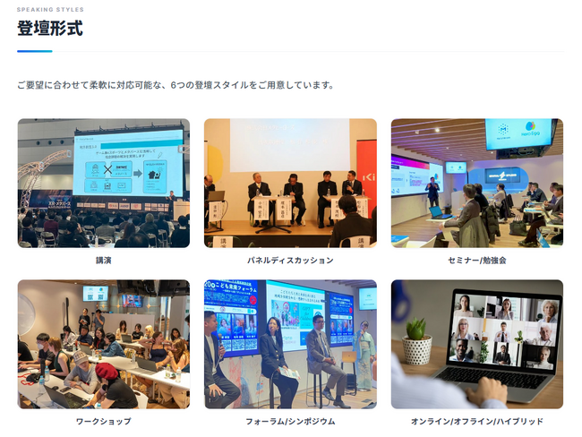 - フォーラム/シンポジウム: 大規模イベントでの基調講演や公的シンポジウムへの登壇