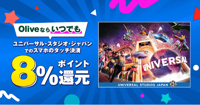 株式会社三井住友銀行(本社:東京都千代田区、頭取 CEO:福留 朗裕、以下「三井住友銀行」)、三井住友カード株式会社(本社:東京都江東区、代表取締役 社長執行役員 CEO:大西 幸彦、以下「三井住友カード」)は、2026年4月1日よりOlive会員がユニバーサル・スタジオ・ジャパンのパーク内およびユニバーサル・シティウォーク大阪でもっとお得に楽しめるよう、従来のスマホのタッチ決済で7%還元に+1%を加え、合計8%還元とするポイントサービスの改定を行います。